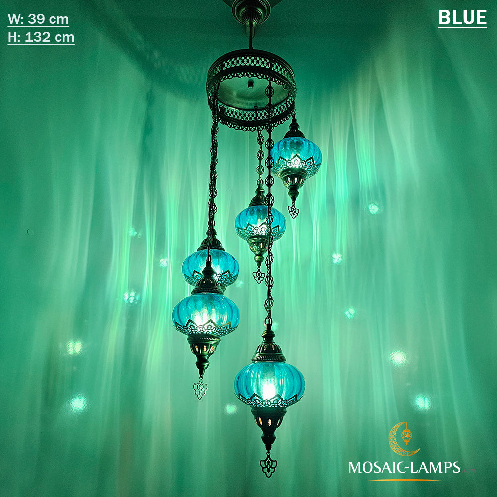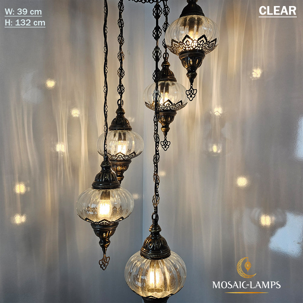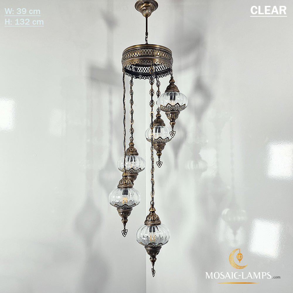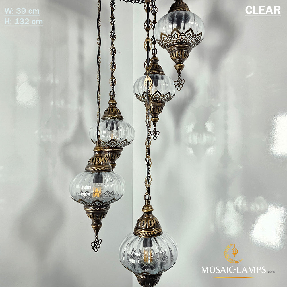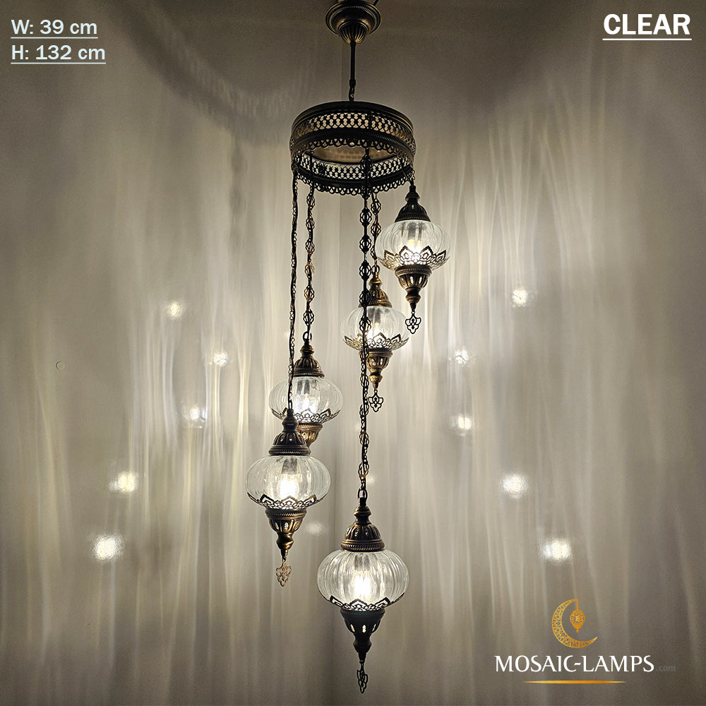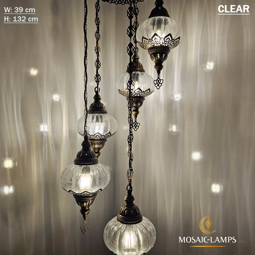 5 Globe Lights with Blown Glass Optic, Spiral Design Clear Ottoman Chandelier, Moroccan Spiral Chandelier, Stair Lights, Cafe, Restaurant.
