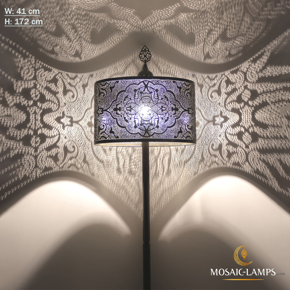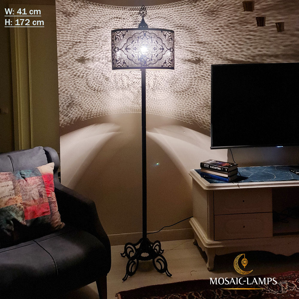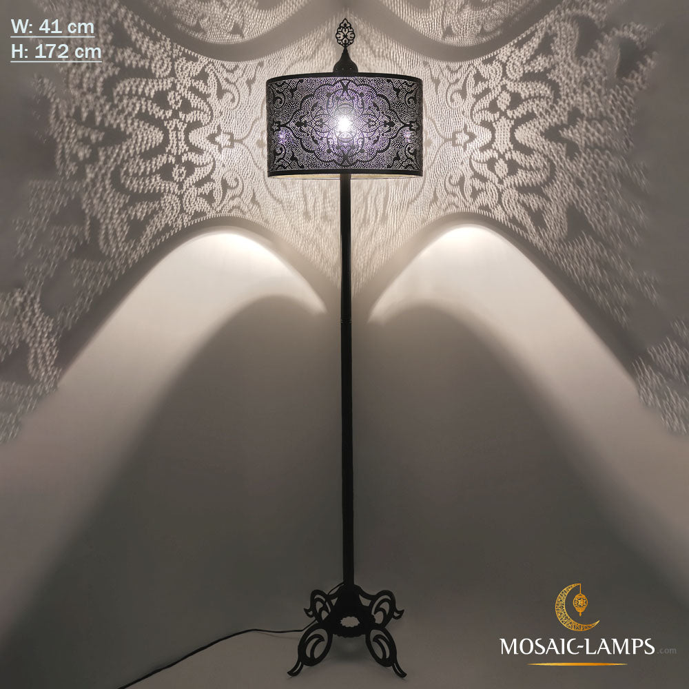 Lámpara de pie con pantalla grande, luces de base de metal perforado hechas a mano marroquíes, luces de salón tradicionales, lámparas de pie auténticas de restaurante.