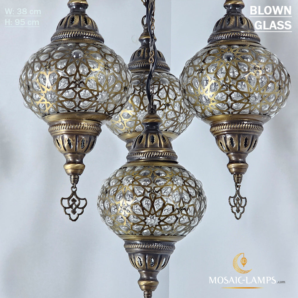 4 Blown Glass Moroccan Chandeliers, Laser Globe Ottoman Lamps, Bronze Globe Lights, Seljuk Motif Clear Lamp, Restaurant, Living Room, Cafe.