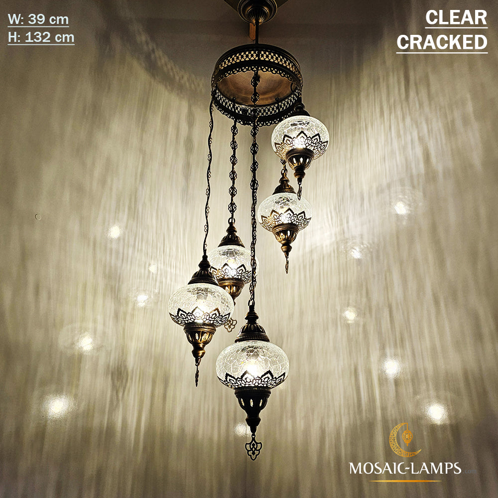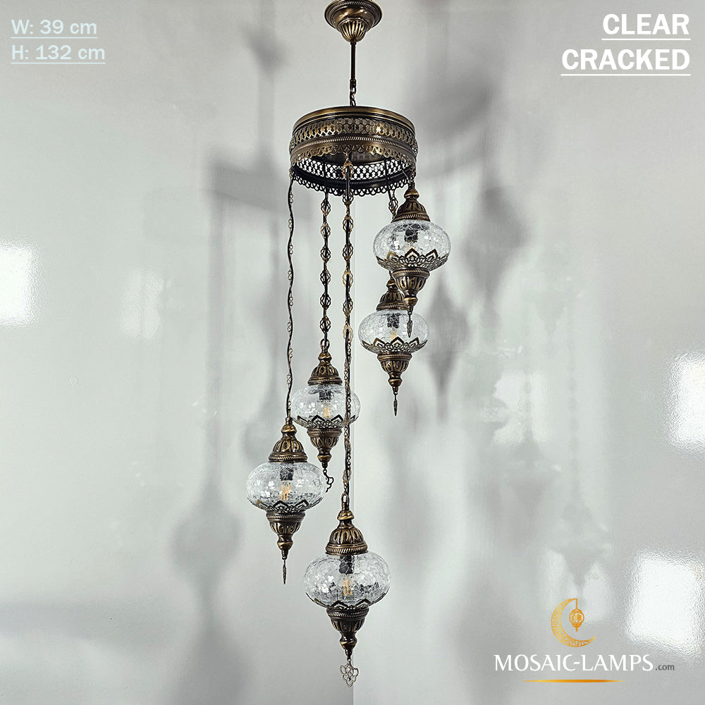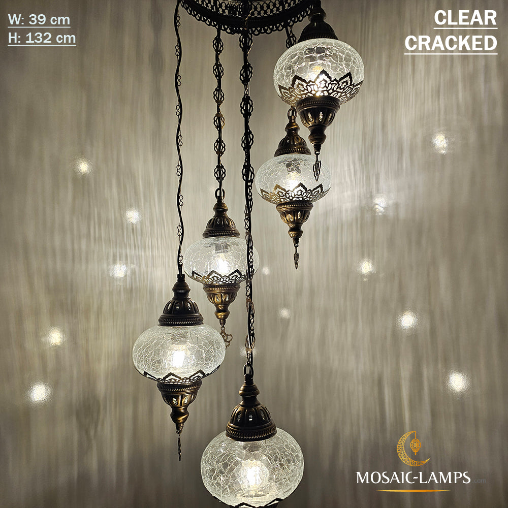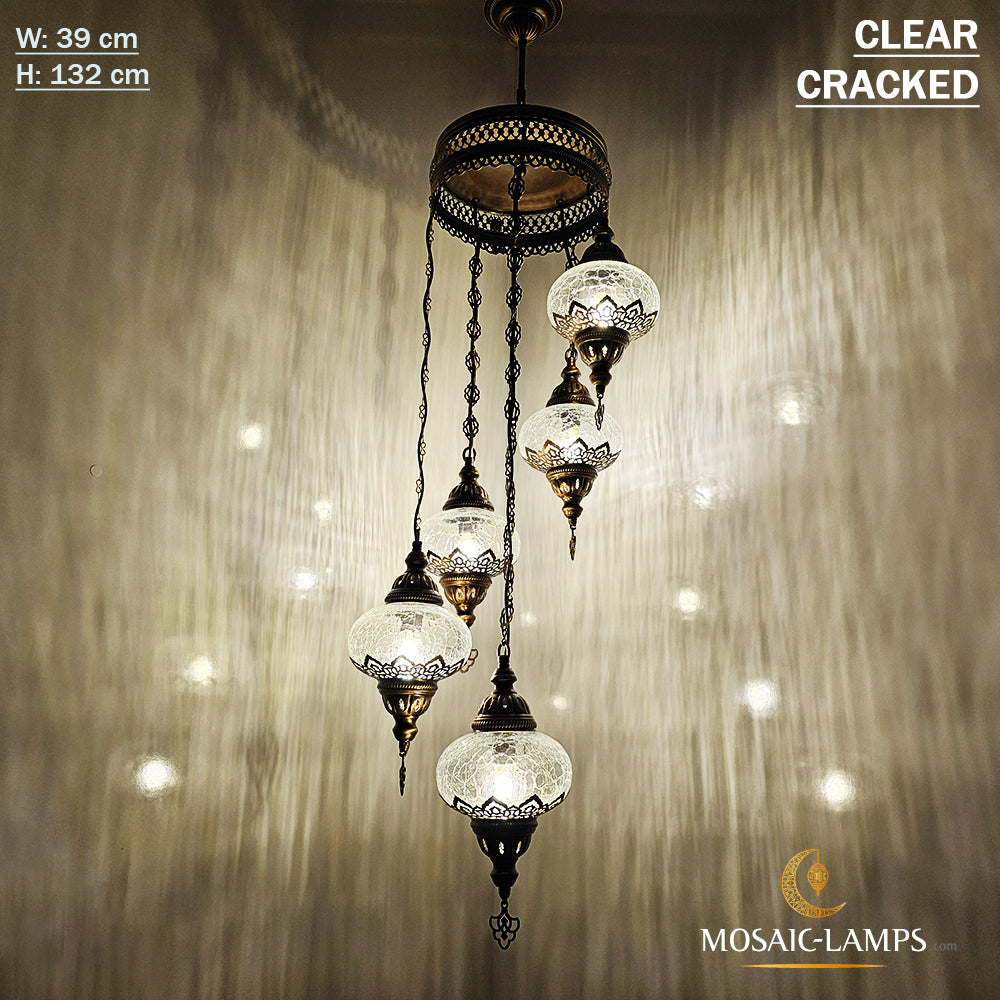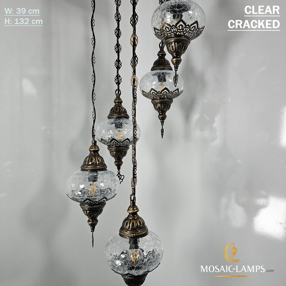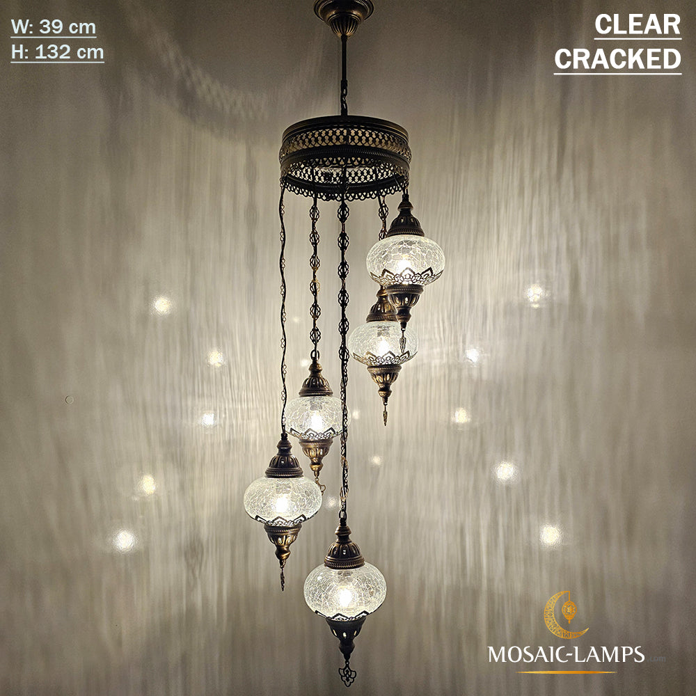 Clear 5 Globe Chandelier, Crackle Globe Set Of 5 Spiral Chandeliers, Living Room Chandeliers, Kitchen Chandelier, Moroccan Stair Chandeliers. Single Arm Ceiling Suspension, Circle Closed Top.