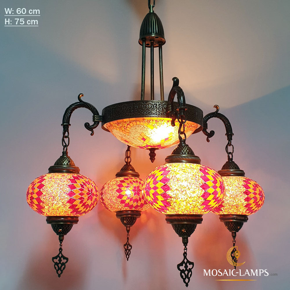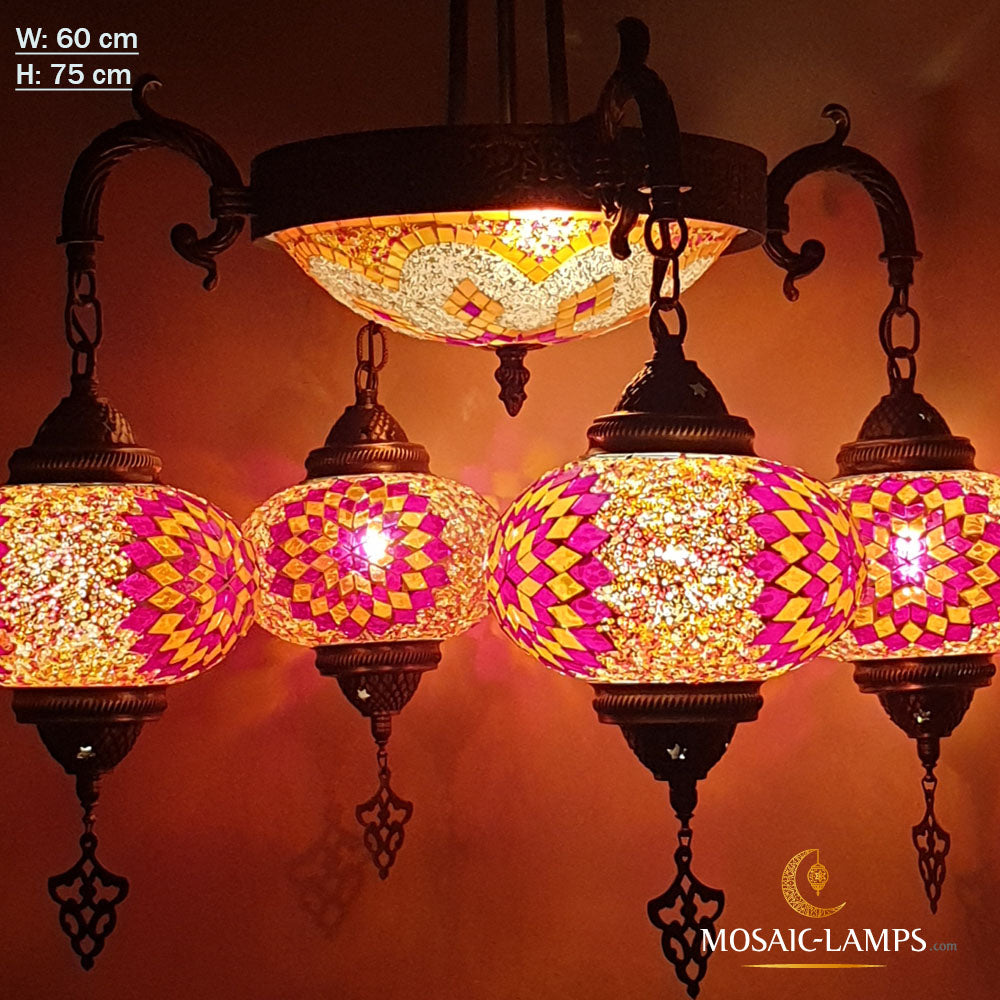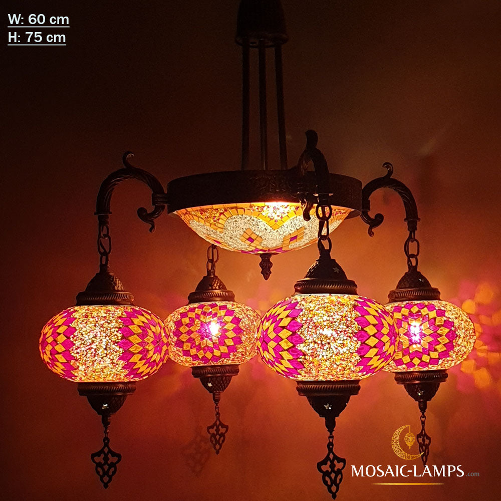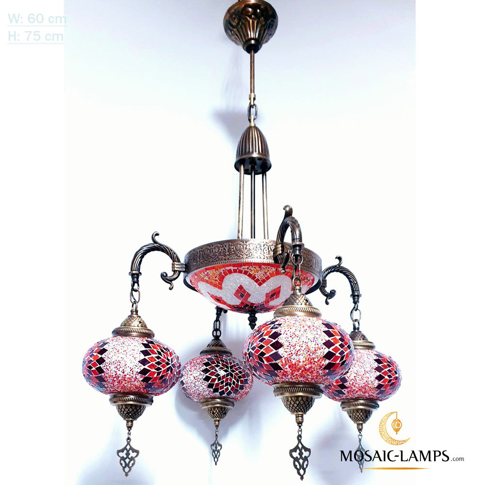 7 Color, 4+1 Globe Candlestick Living Room Chandelier, Brass Metal Handmade Turkish, Moroccan Authentic Mosaic Lamp, Bedroom Pendant Lights