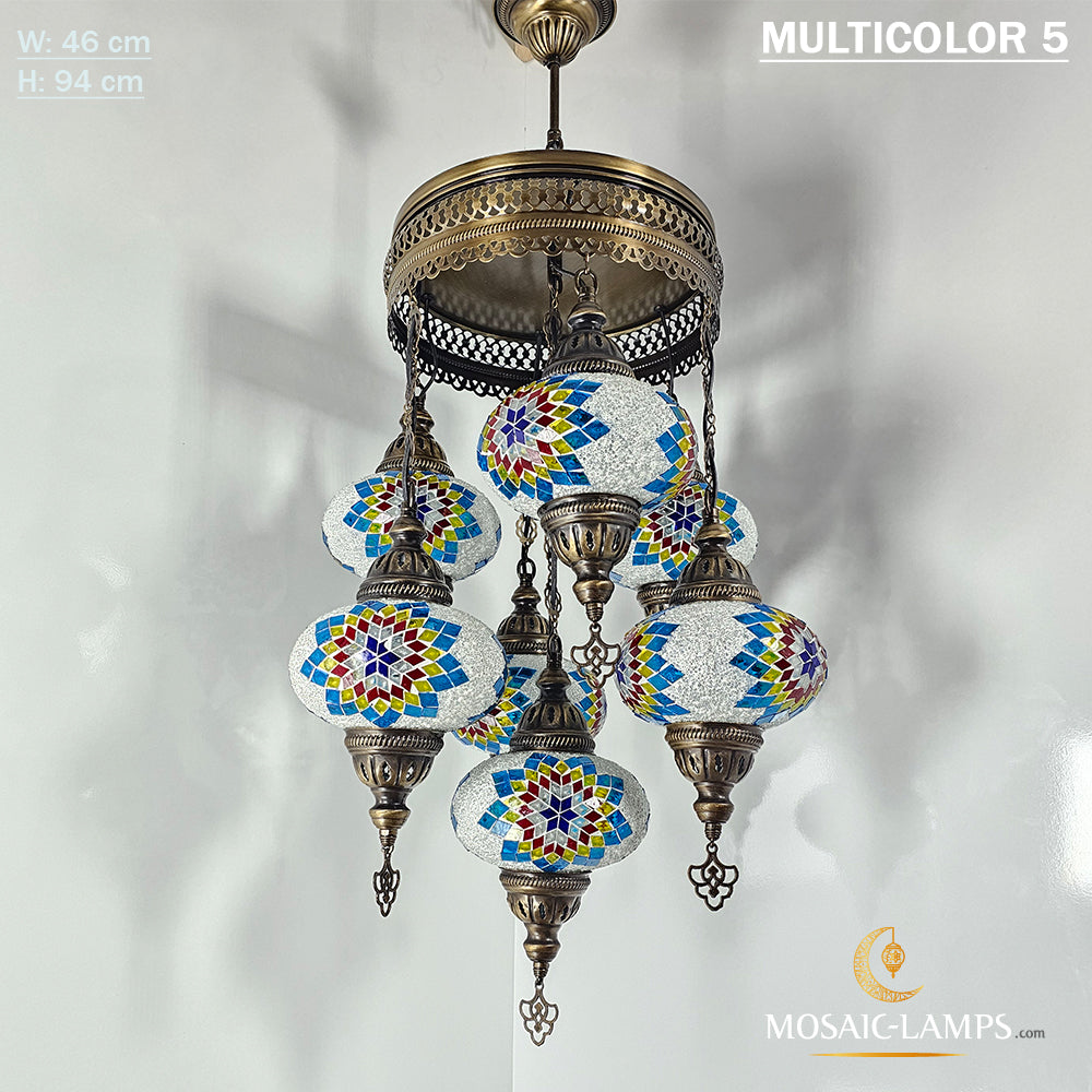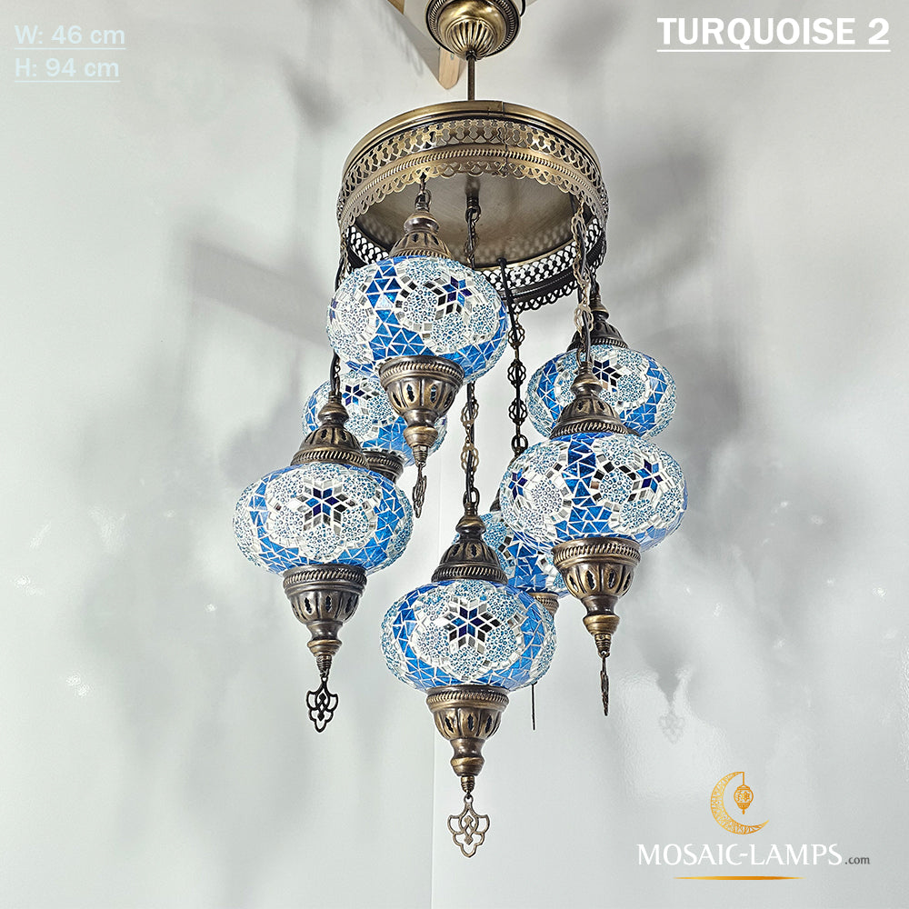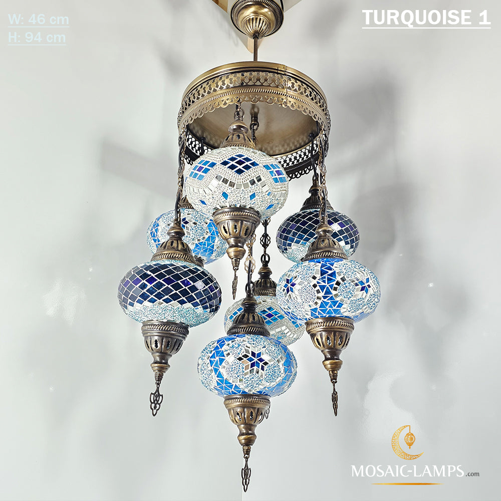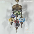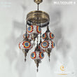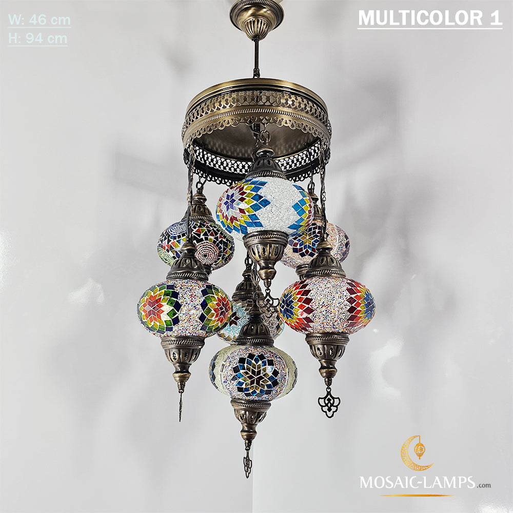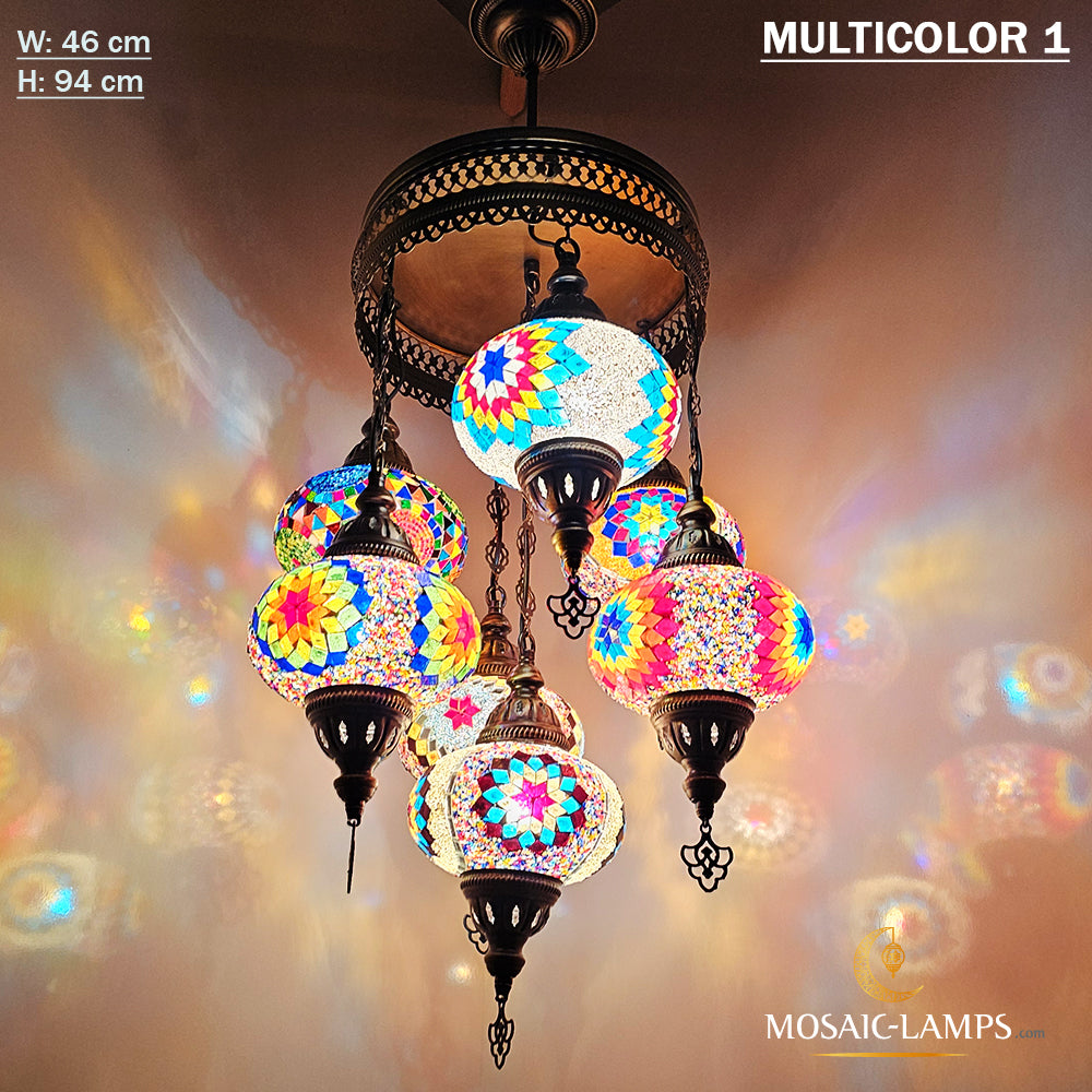 The 7-sphere Sultan chandelier model, one of the most beautiful examples of traditional handmade Turkish mosaic lamps. Mixed with glass spheres of different colors and designs, our chandelier offers you the atmosphere of 1001 night tales with stylish and different color mixtures. With its 7 spheres, it is large enough to meet the lighting of many houses.