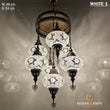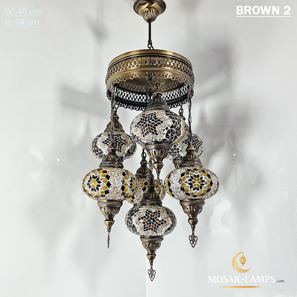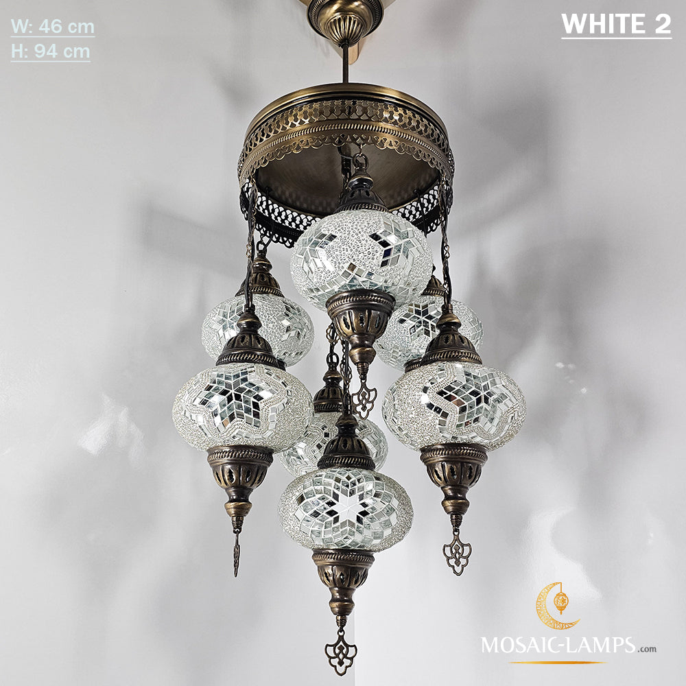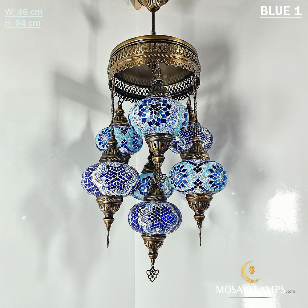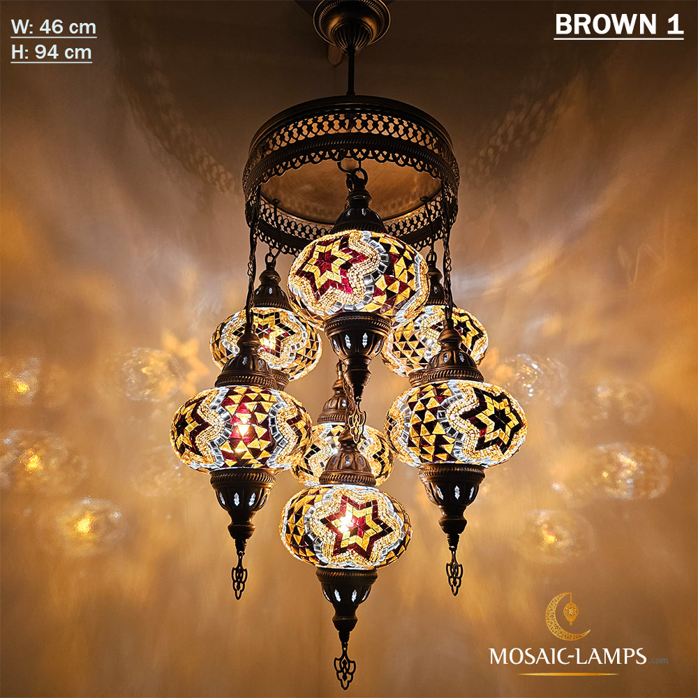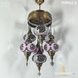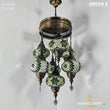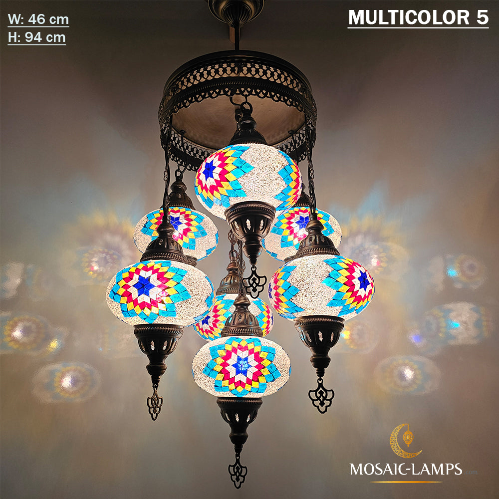The 7-sphere Sultan chandelier model, one of the most beautiful examples of traditional handmade Turkish mosaic lamps. Mixed with glass spheres of different colors and designs, our chandelier offers you the atmosphere of 1001 night tales with stylish and different color mixtures. With its 7 spheres, it is large enough to meet the lighting of many houses.