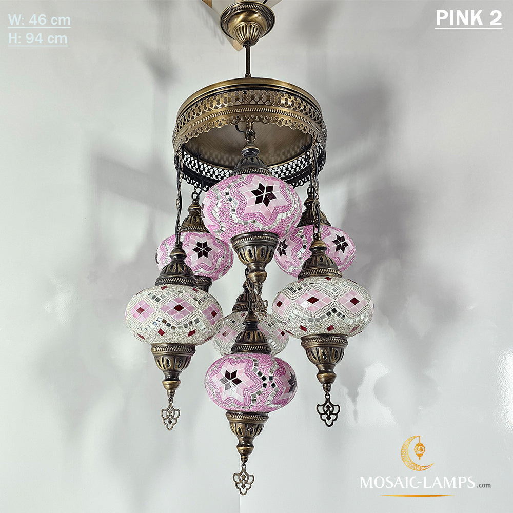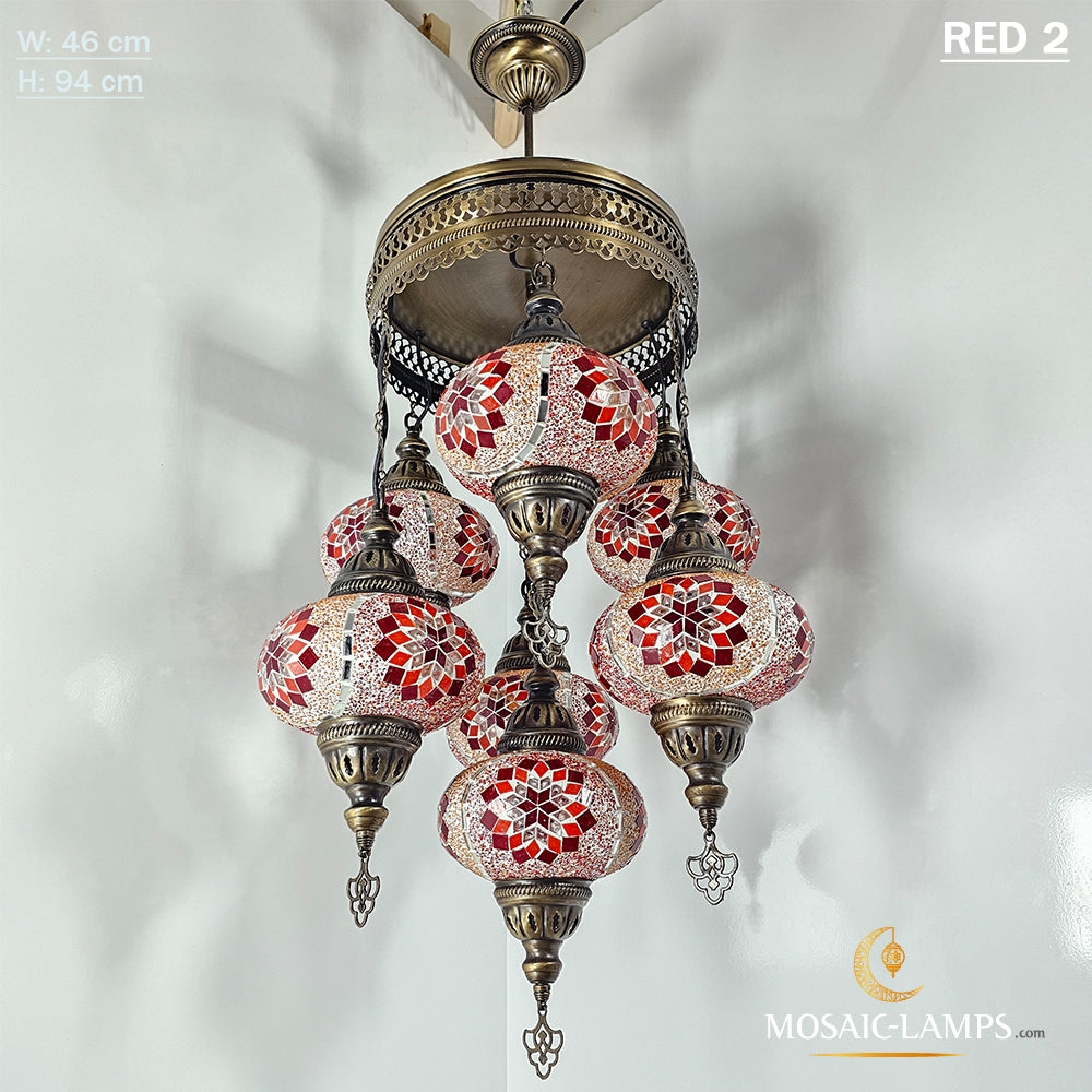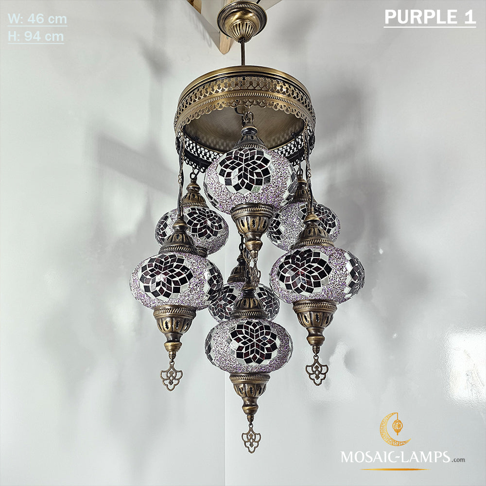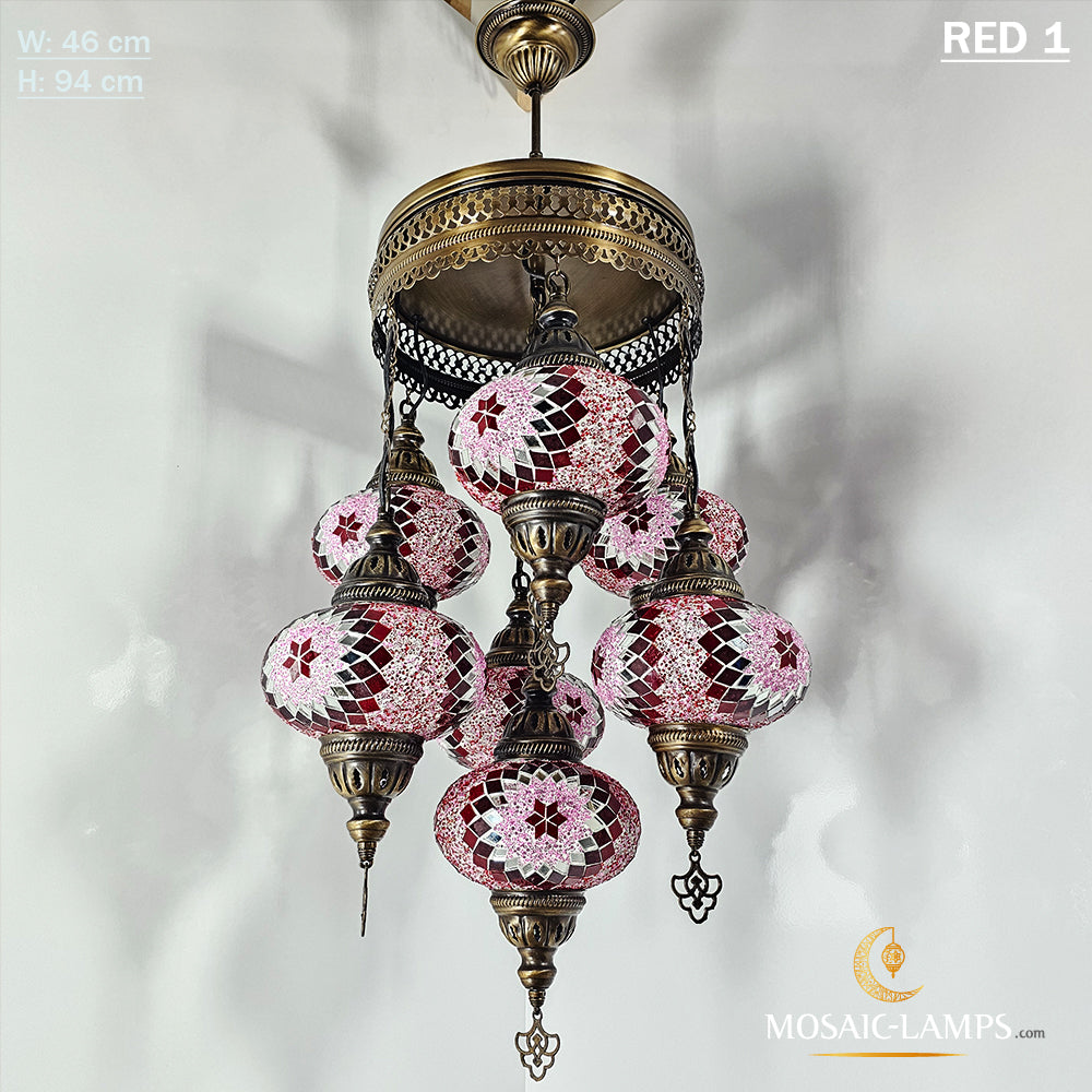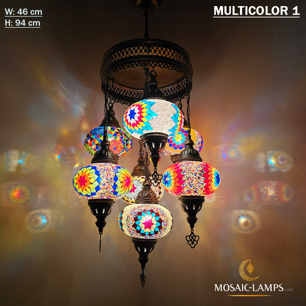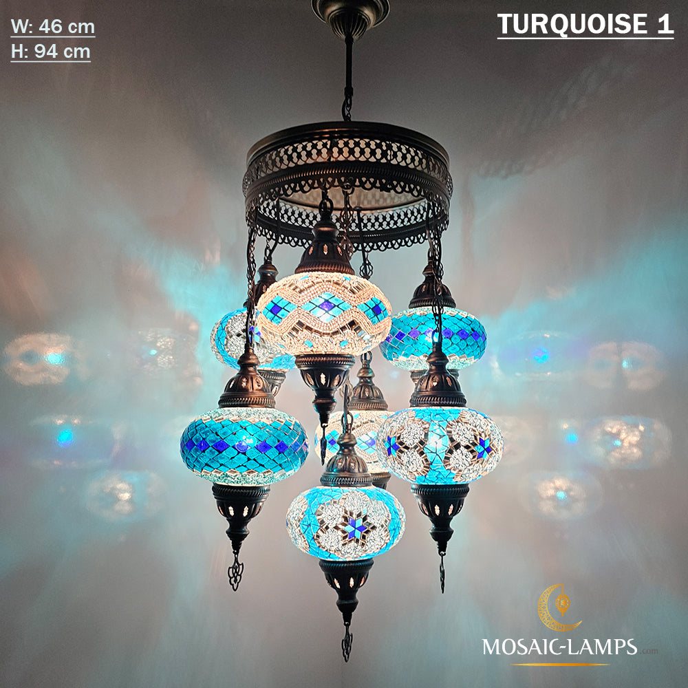 The 7-sphere Sultan chandelier model, one of the most beautiful examples of traditional handmade Turkish mosaic lamps. Mixed with glass spheres of different colors and designs, our chandelier offers you the atmosphere of 1001 night tales with stylish and different color mixtures. With its 7 spheres, it is large enough to meet the lighting of many houses.