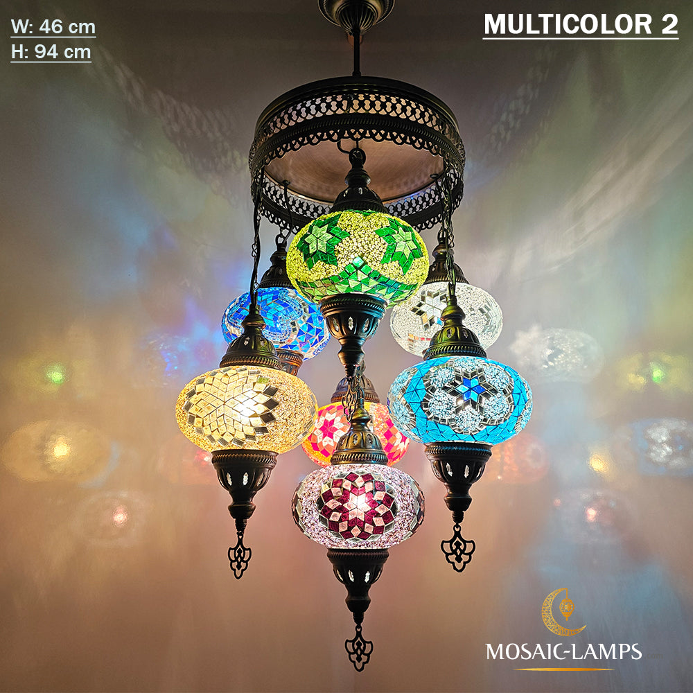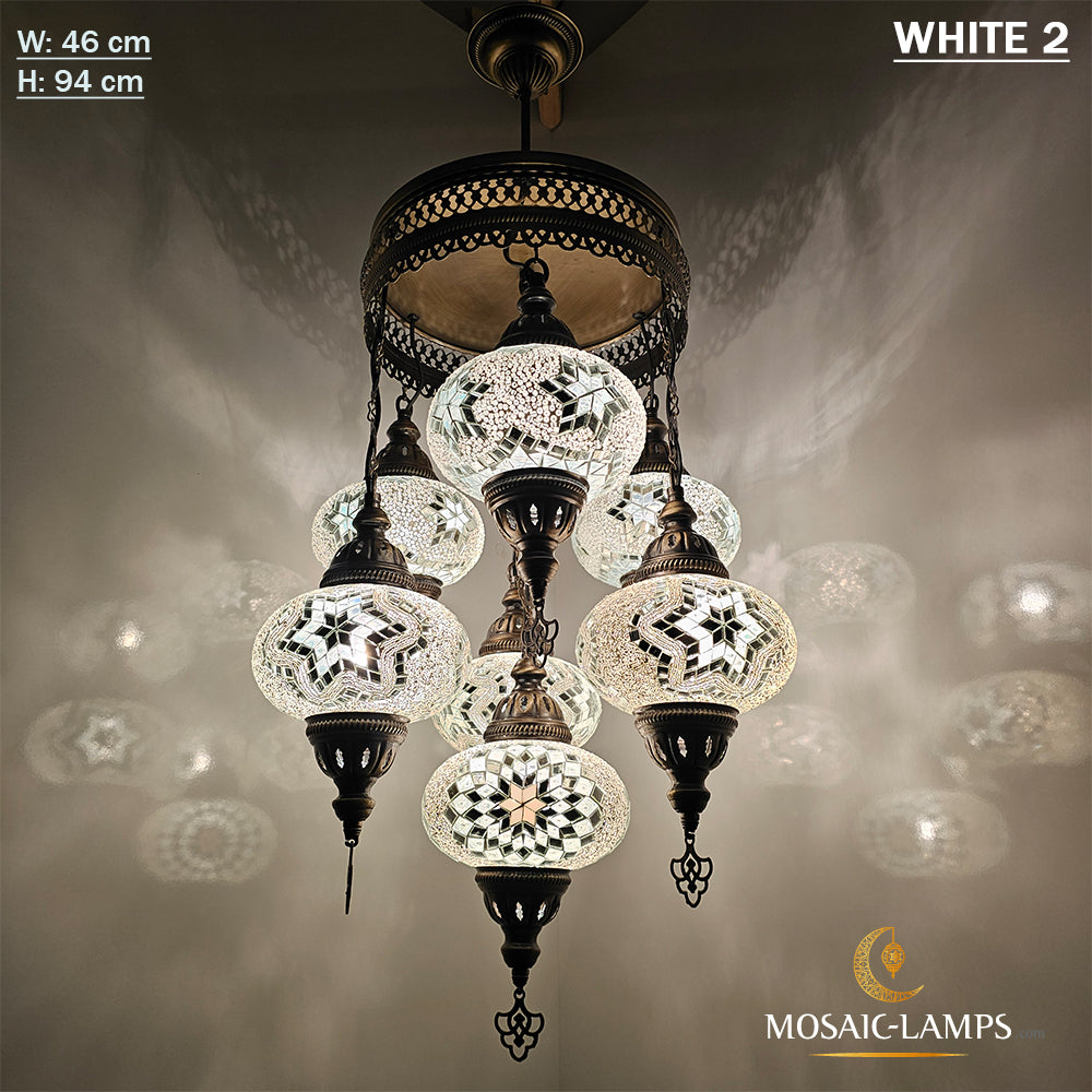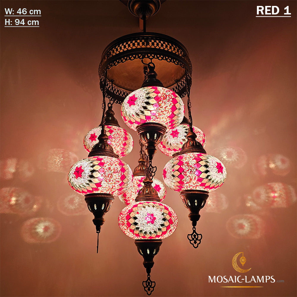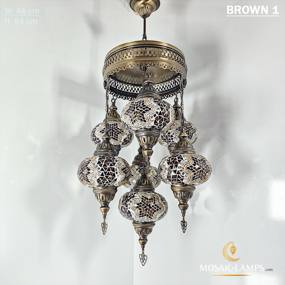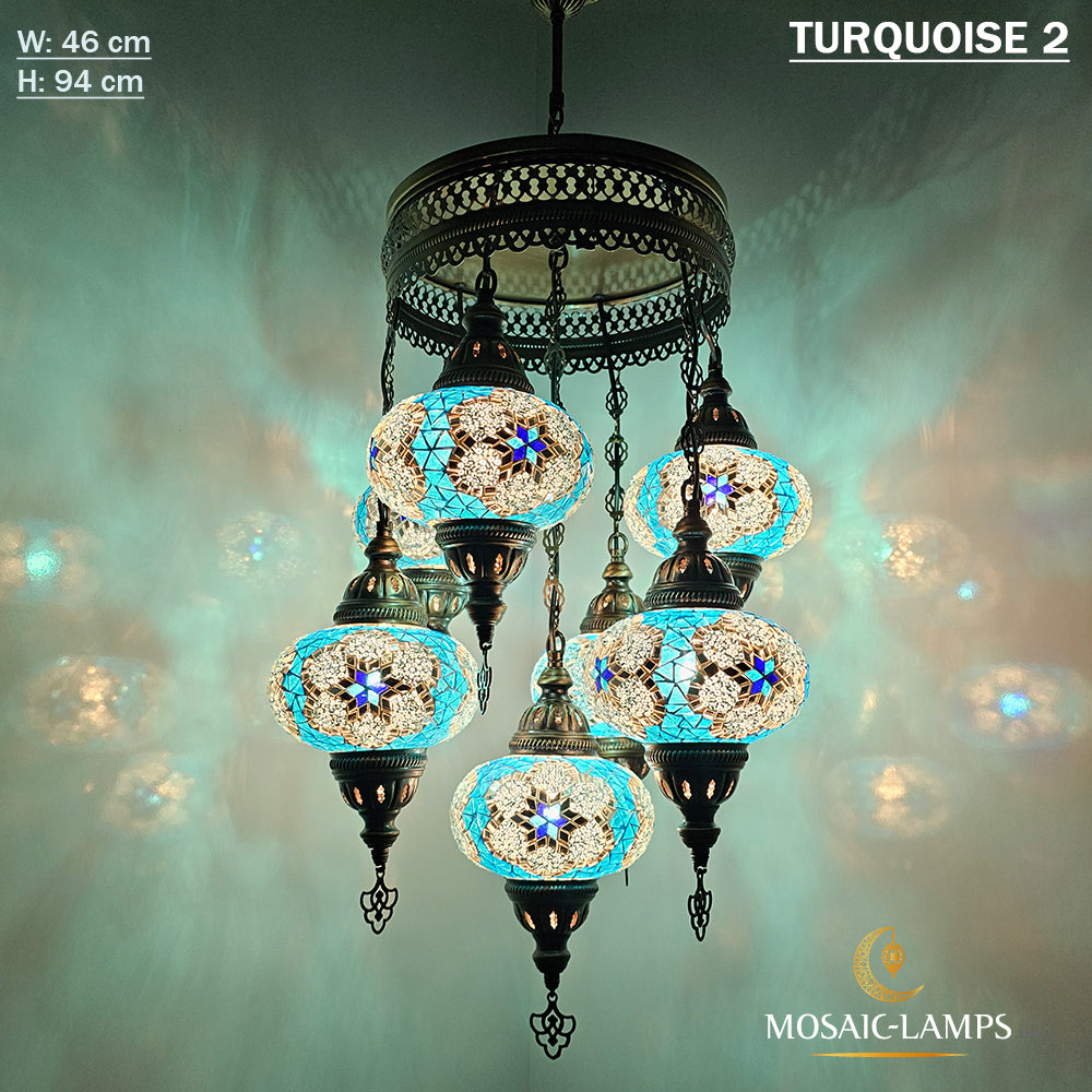The 7-sphere Sultan chandelier model, one of the most beautiful examples of traditional handmade Turkish mosaic lamps. Mixed with glass spheres of different colors and designs, our chandelier offers you the atmosphere of 1001 night tales with stylish and different color mixtures. With its 7 spheres, it is large enough to meet the lighting of many houses.