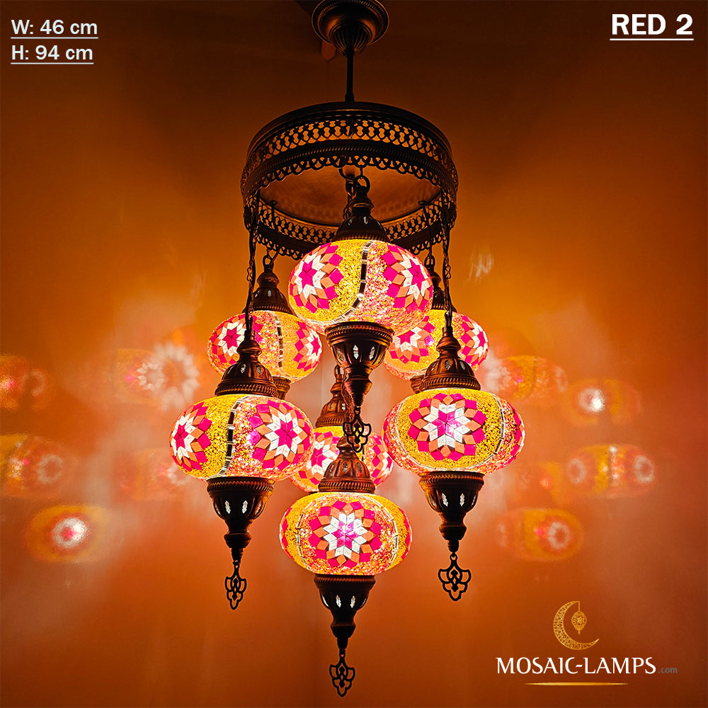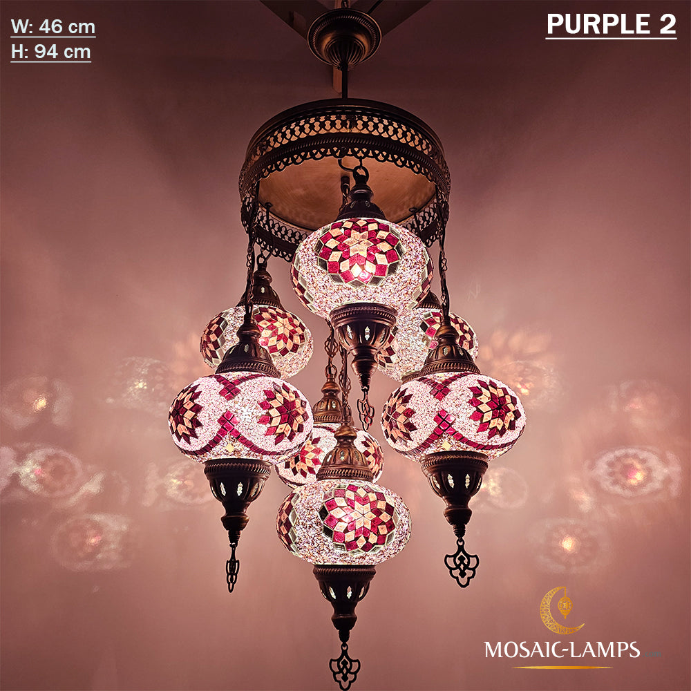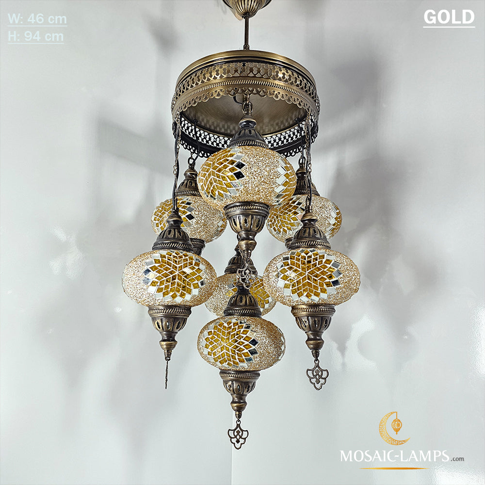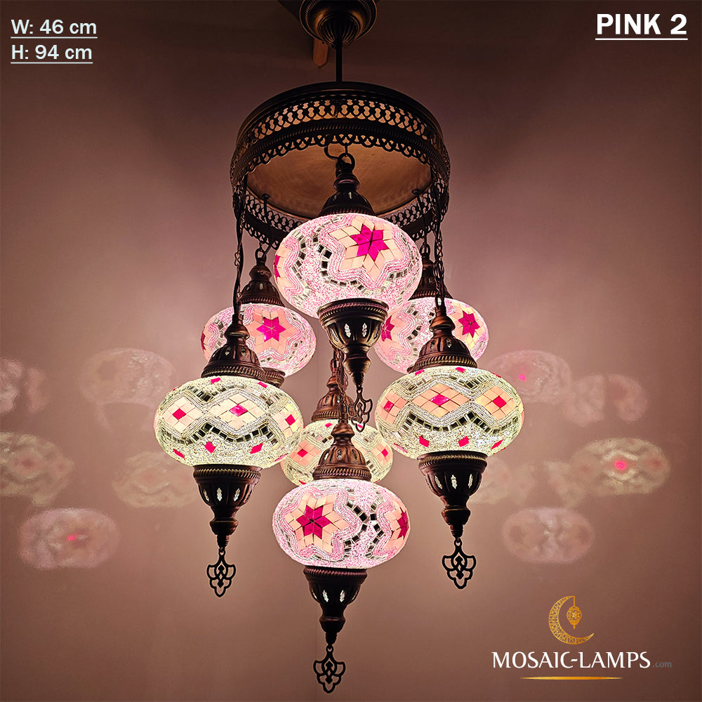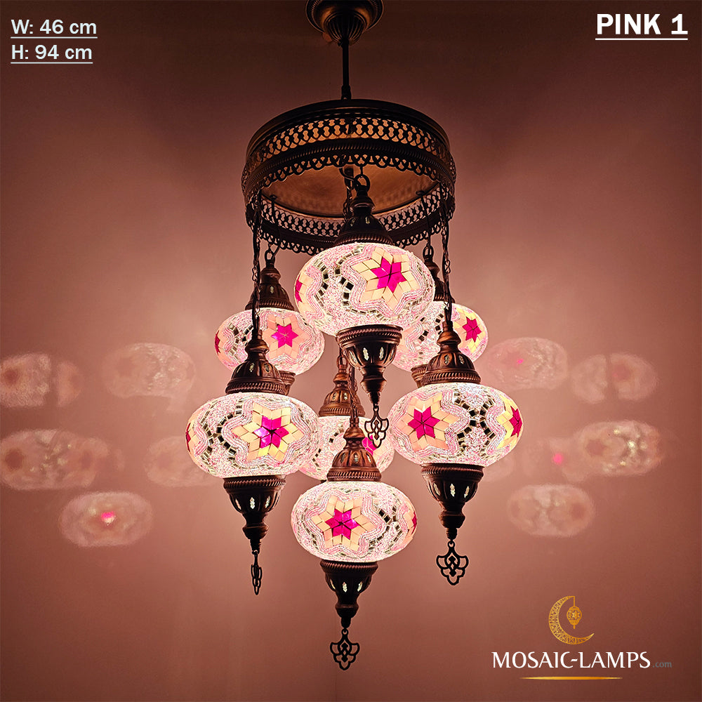 The 7-sphere Sultan chandelier model, one of the most beautiful examples of traditional handmade Turkish mosaic lamps. Mixed with glass spheres of different colors and designs, our chandelier offers you the atmosphere of 1001 night tales with stylish and different color mixtures. With its 7 spheres, it is large enough to meet the lighting of many houses.