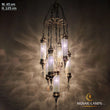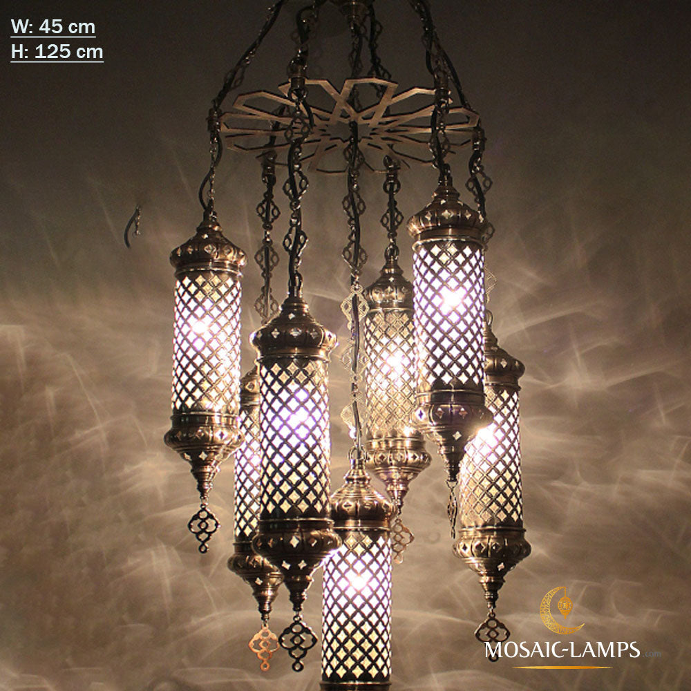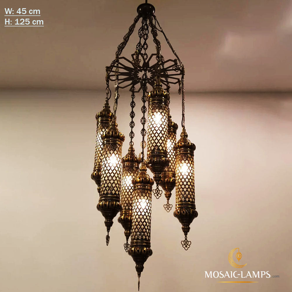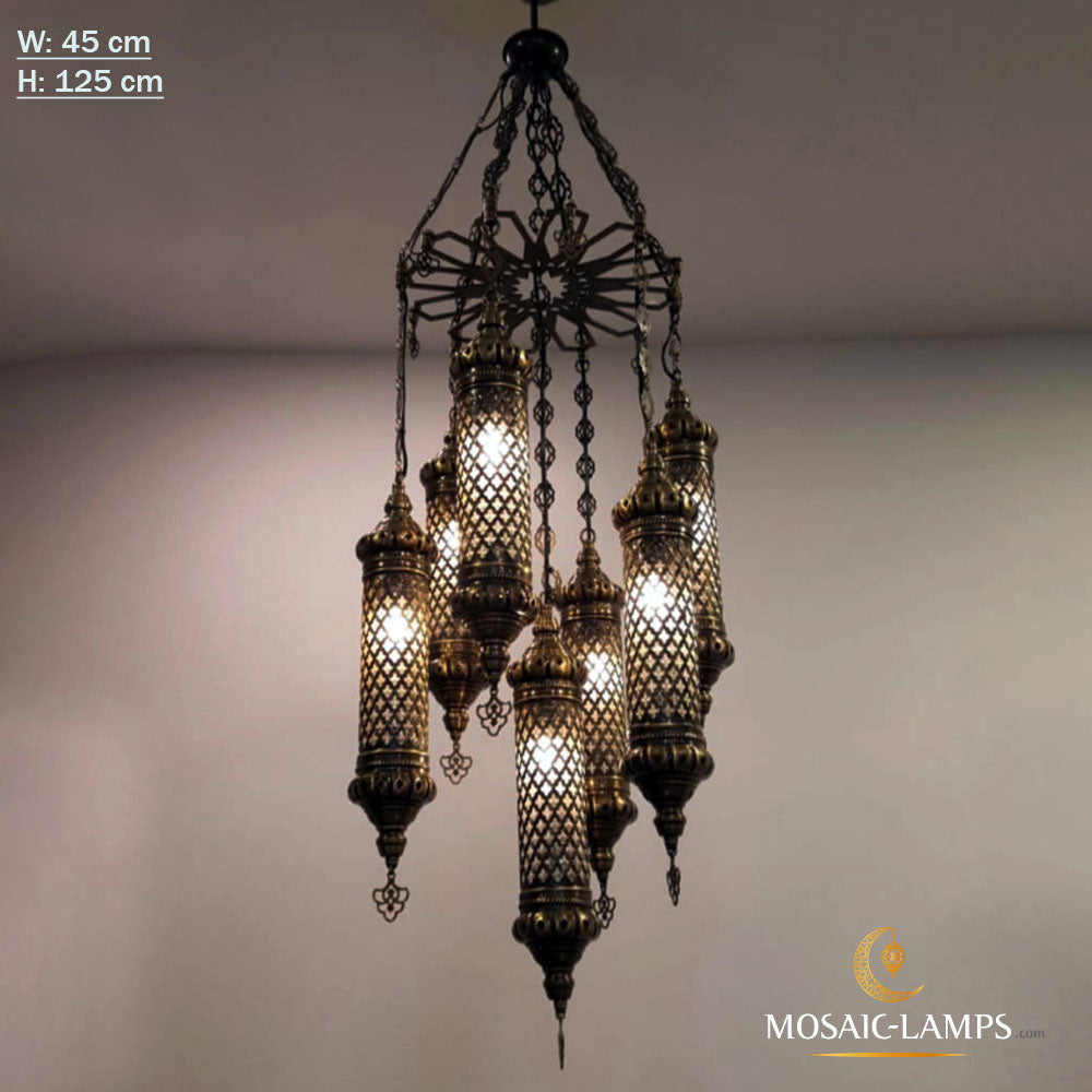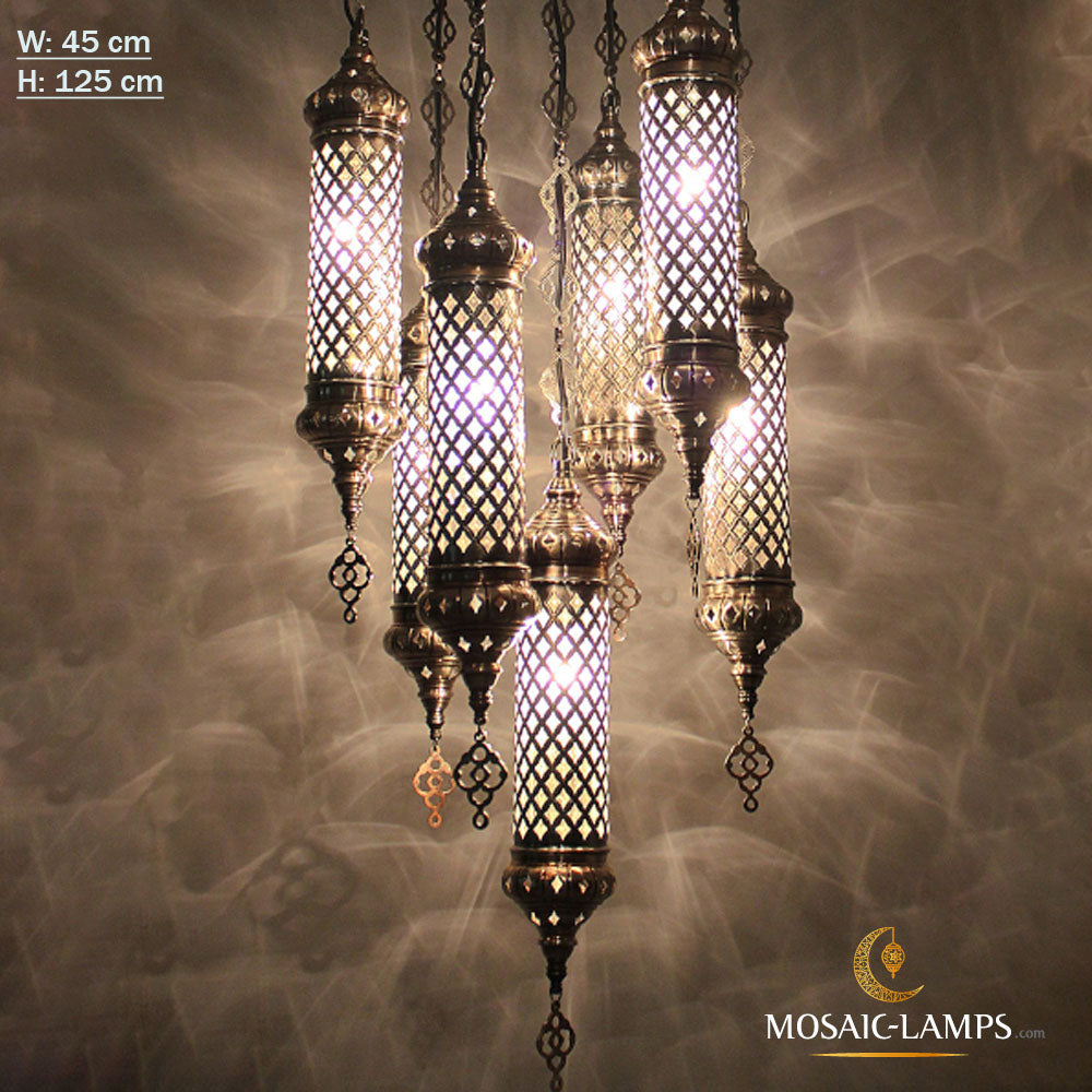 7 Laser Blown Pipe Globe Moroccan Chandelier Sets, Ottoman Lighting Hanging Lamps, Authentic Metal Turkish Lights, Living Room, Bedroom, Hotel.