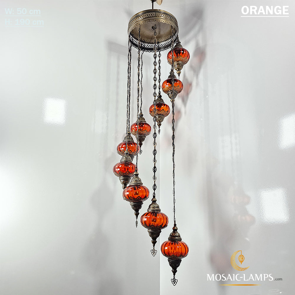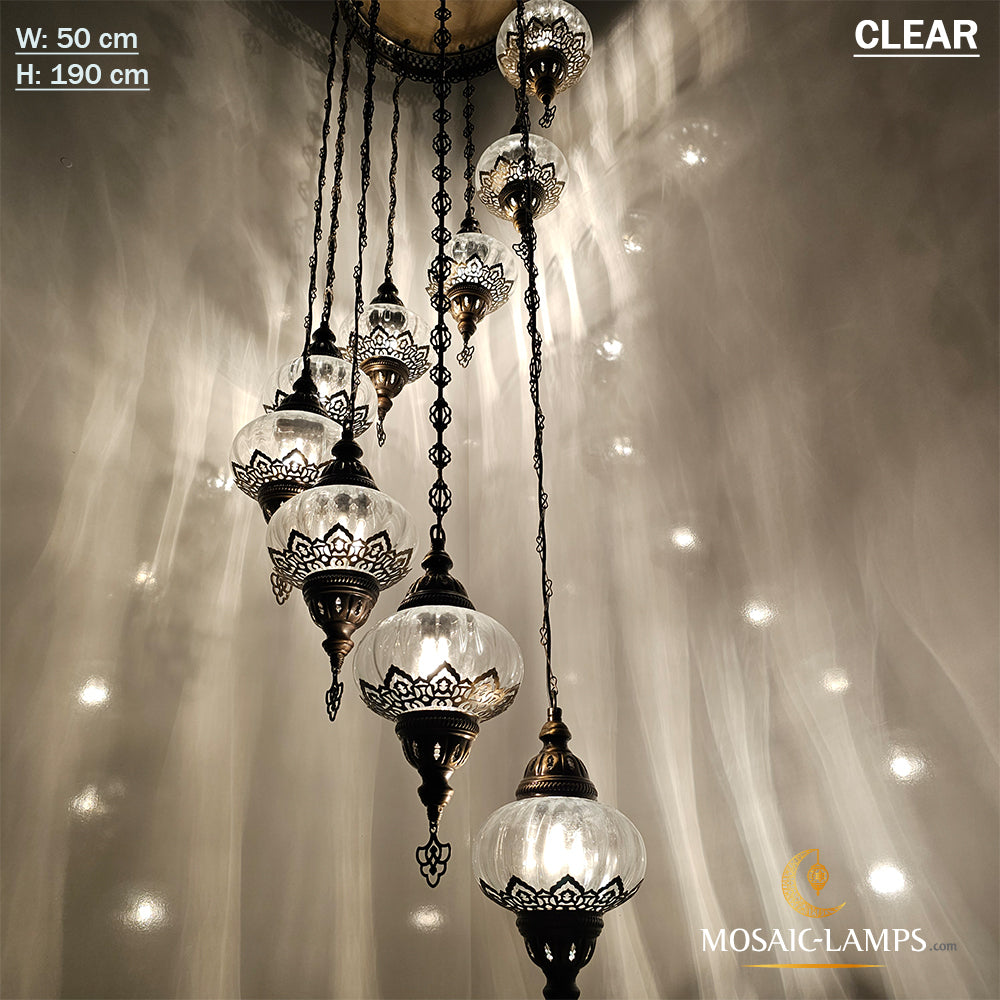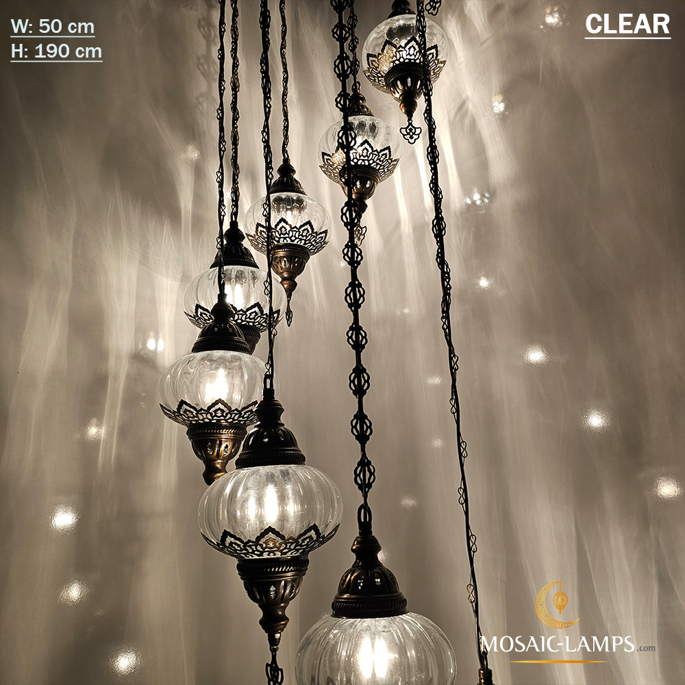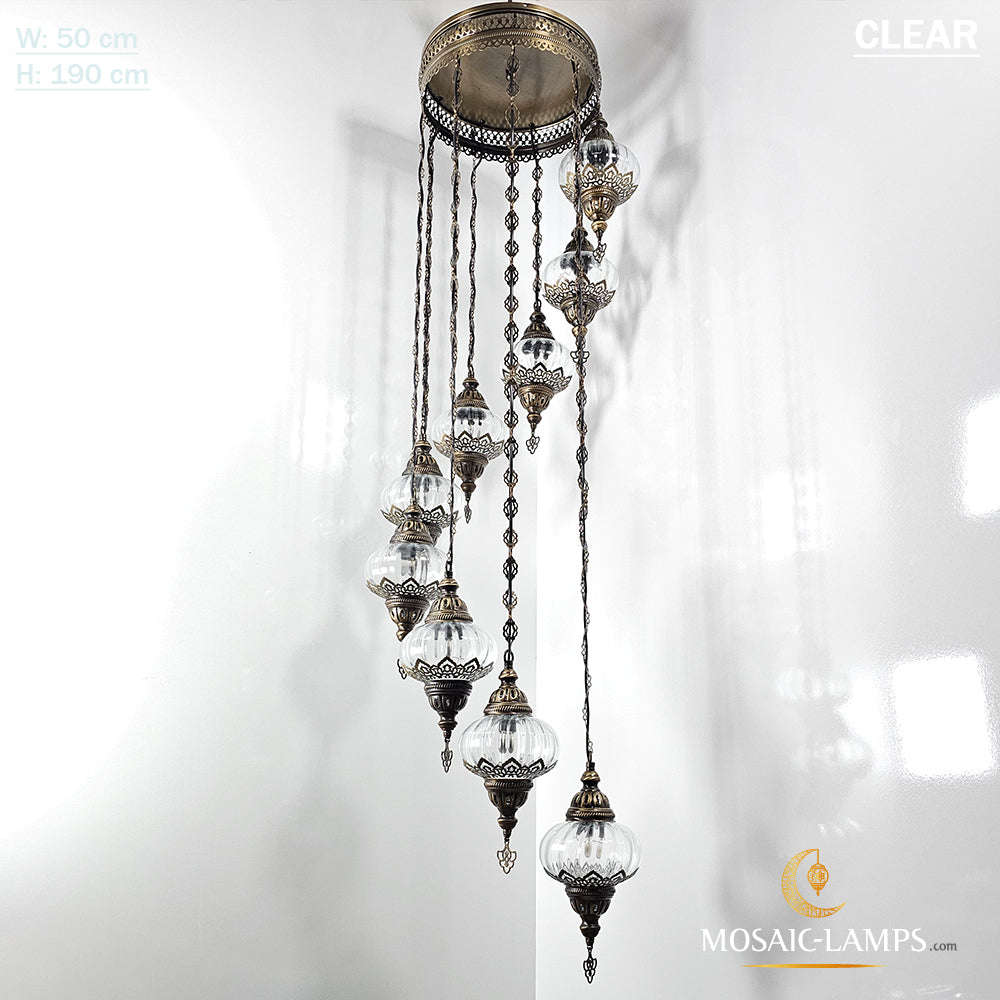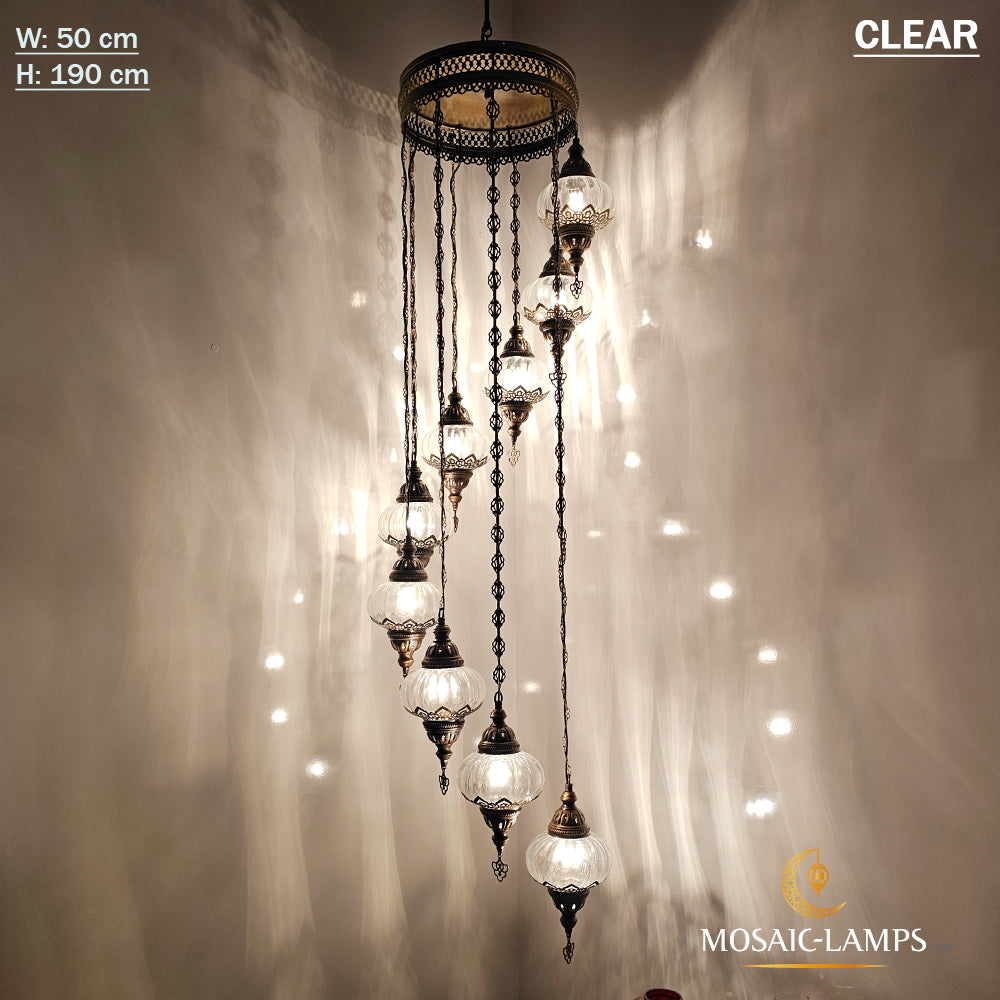 Clear Optical 9 Globe Spiral Chandelier, Stairwell, Hallway, Restaurant, Entrance, Living Room, High Ceiling Lamps, Ottoman Moroccan Lights.