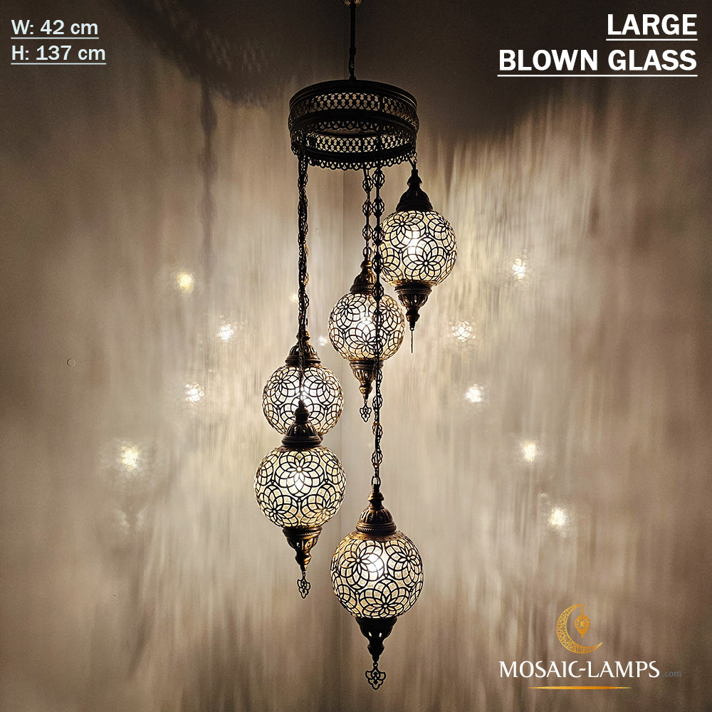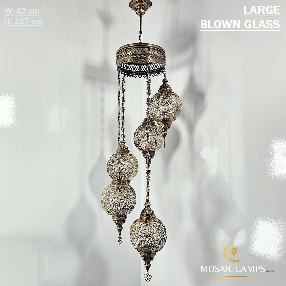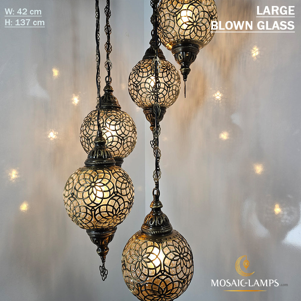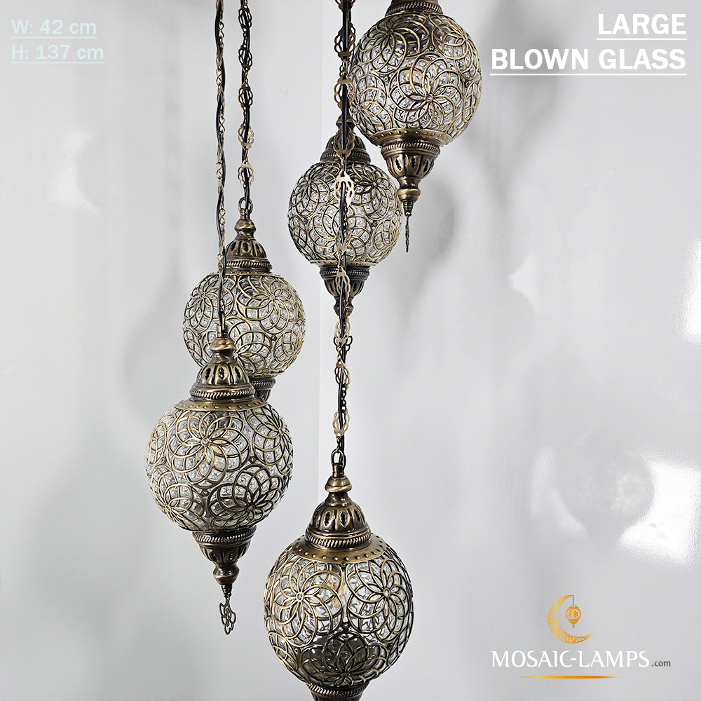 Large Blown Globe Spiral Chandelier, Set of 5 Ball Ottoman Lamps, Moroccan Restaurant Lights, Living Room Lamp, Clear Blown Glass Lighting.