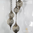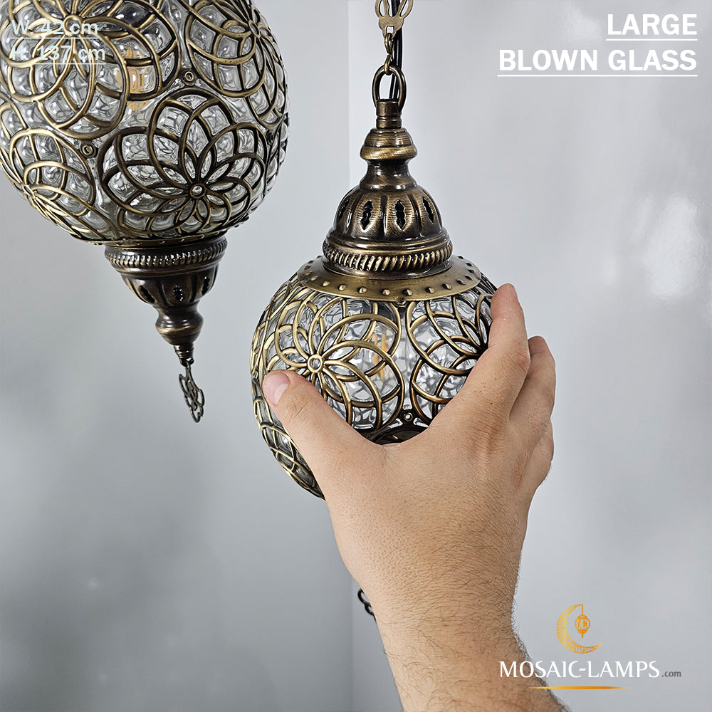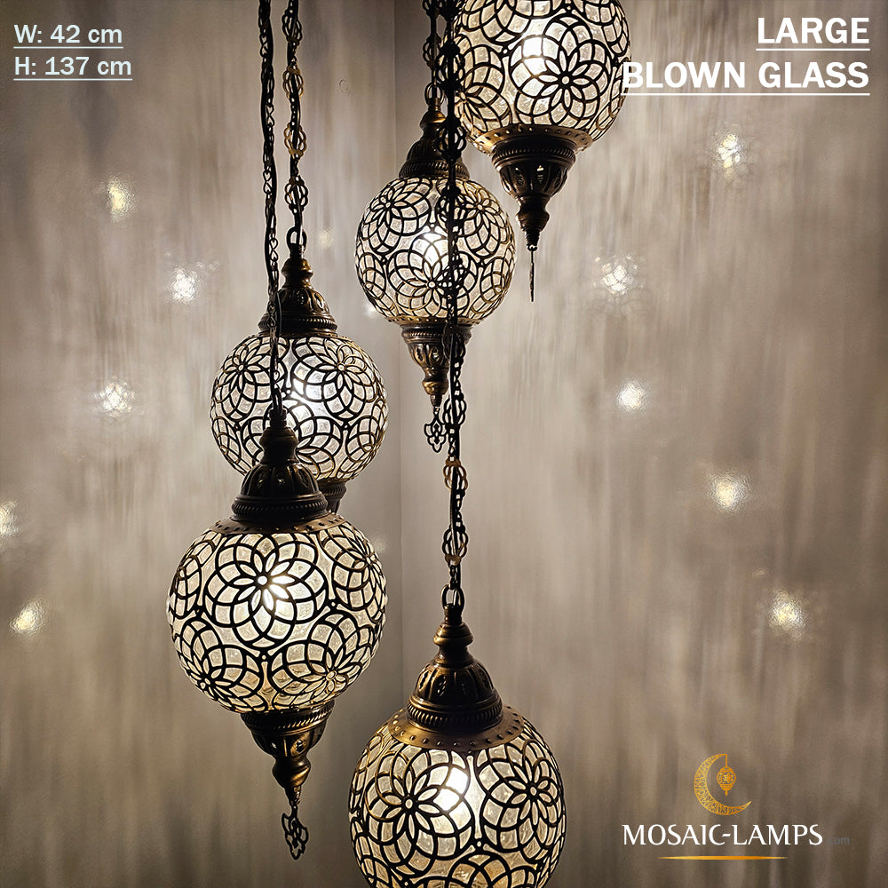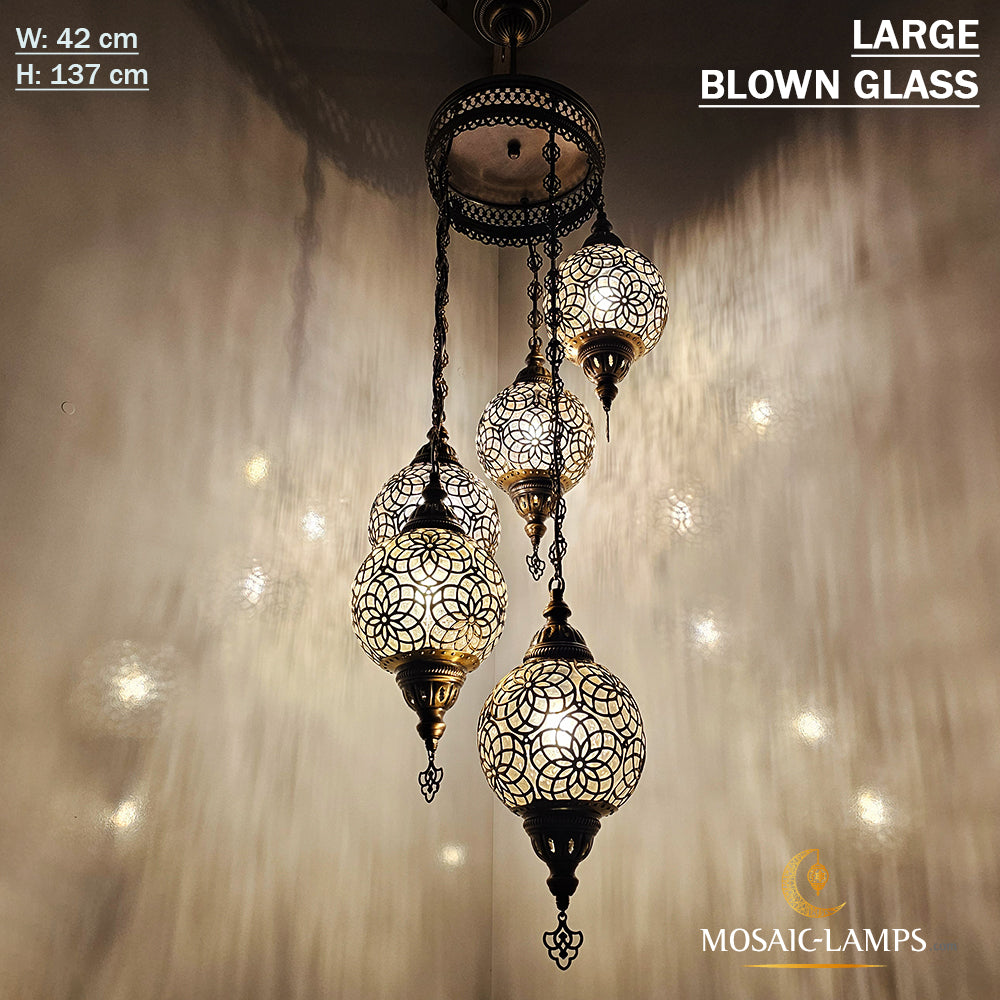 Large Blown Globe Spiral Chandelier, Set of 5 Ball Ottoman Lamps, Moroccan Restaurant Lights, Living Room Lamp, Clear Blown Glass Lighting.